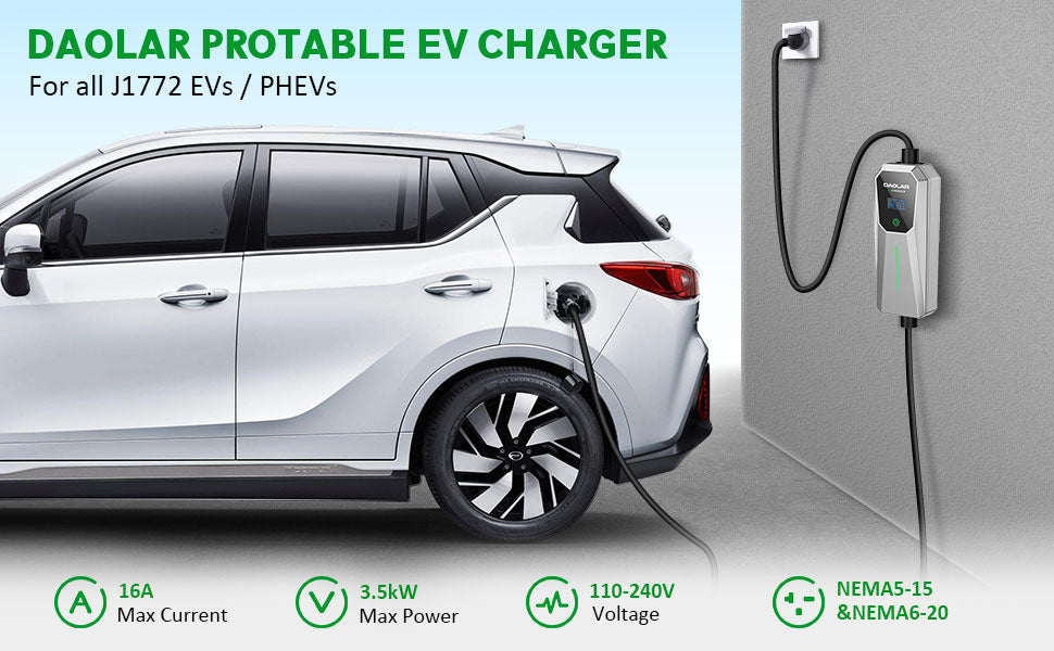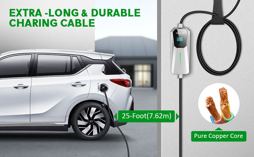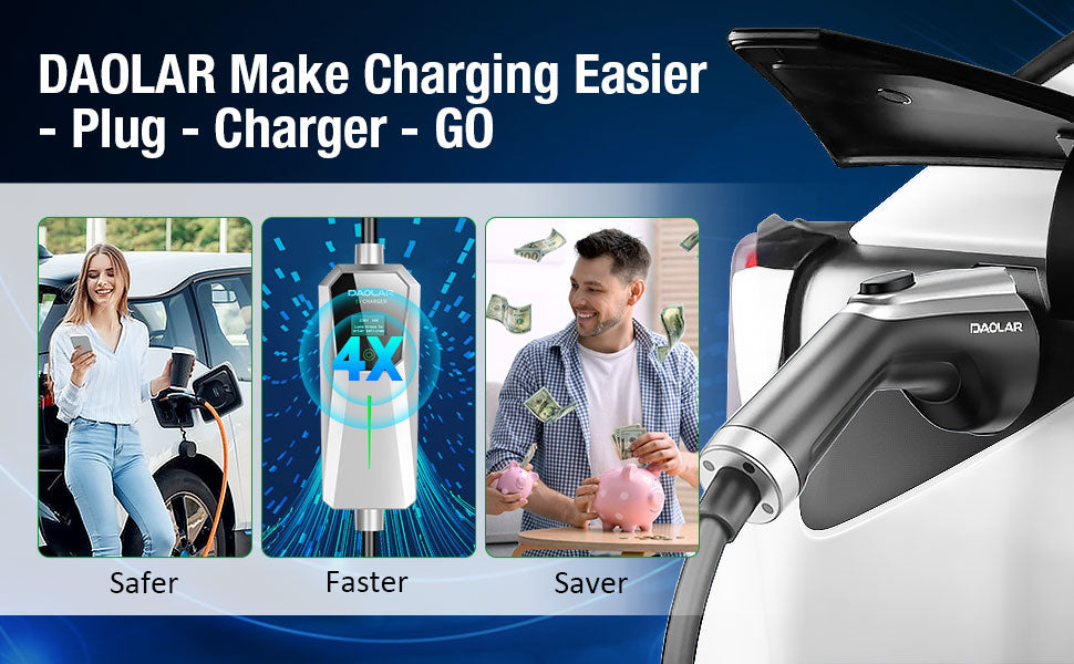 【4x Faster Charging- Level 2 Charging】Daolar V1 EV Charger with NEMA 6-20 Plug offers Level 2 charging for all electric vehicles meeting SAE J1772 standards. Charger with NEMA 6-20 plug could charge your car 4x faster than other 8A level 1 EV chargers you have used before.
