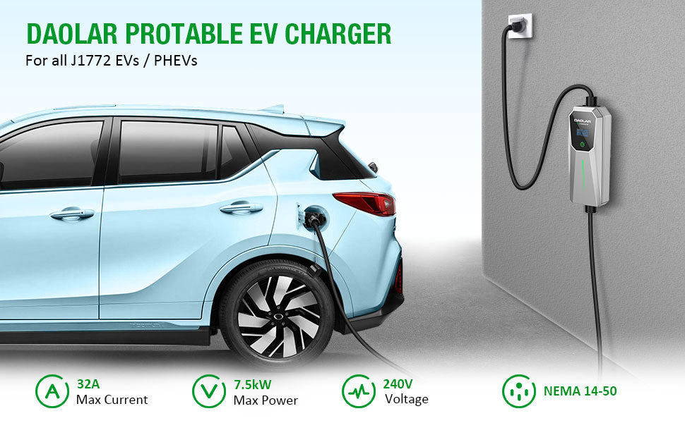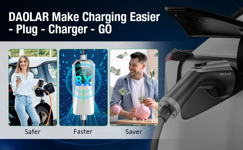 【8x Faster Charging- Level 2 Charging】Daolar V1 EV Charger with NEMA 14-50 Plug offers Level 2 charging for all electric vehicles meeting SAE J1772 standards. Charger with NEMA 14-50 plug could charge your car 8x faster than other 8A level 1 EV chargers you have used before.