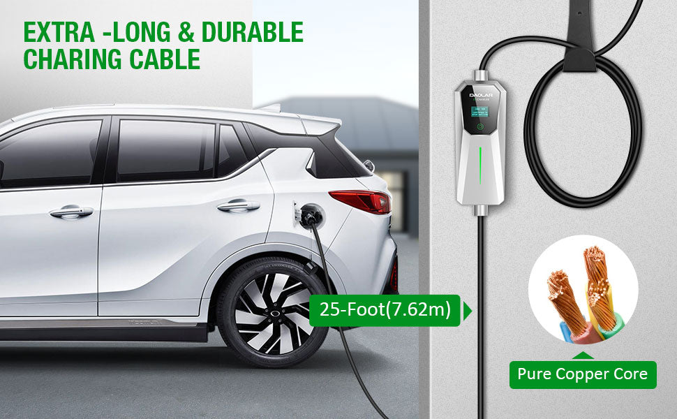 【Portable and easy to operate】Charge your EV anytime and anywhere. It can be taken anywhere and put in the trunk of your car.The 25-foot charging cable gives you the flexibility to easily reach multiple garage compartments or your home's driveway from a single garage wall outlet; it makes charging multiple electric vehicles easy.