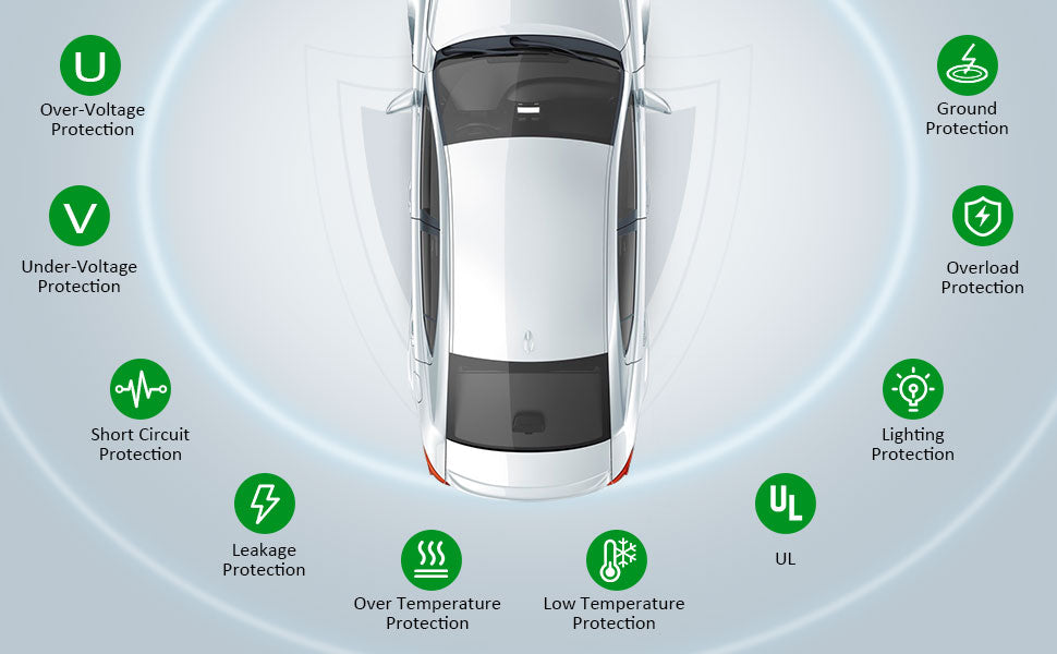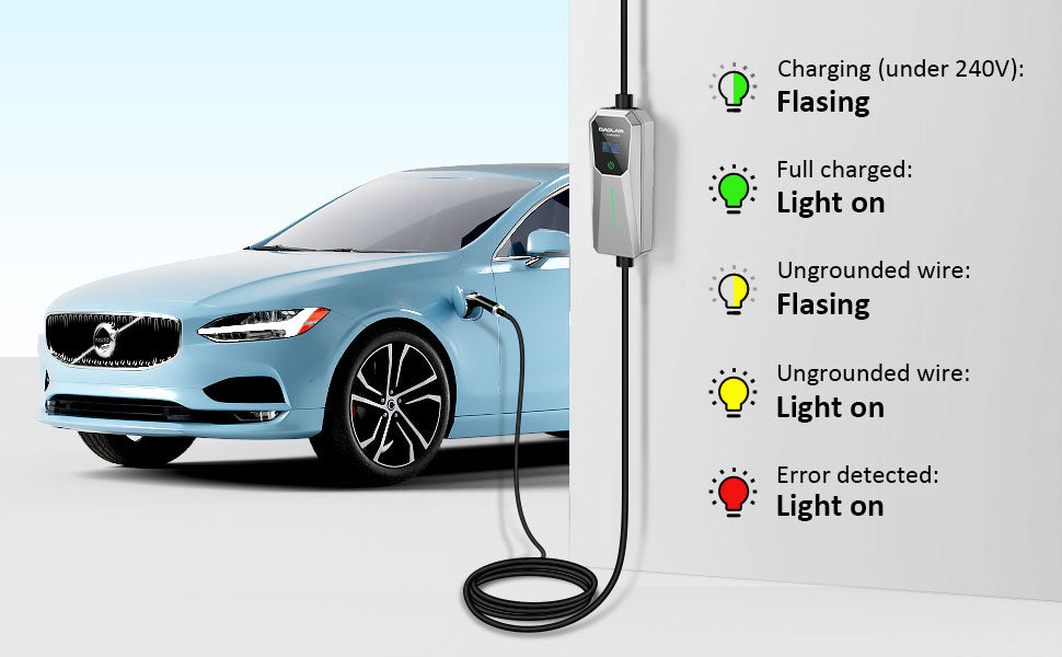 【Multi-Function Display Screen】Our portable electric vehicle charger uses a LCD display that can show charging information such as charging current, voltage, charging time, etc. in real time. In addition, LED lights will flash in different colors to show the EV charging situation and fault indication.