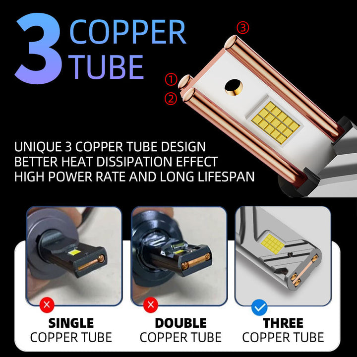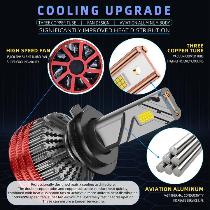 REVOLUTIONARY 3-COPPER TUBE COOLING SYSTEM: Unlike standard bulbs that use single or double heat pipes, this model features a premium Unique 3 Copper Tube design for superior thermal conductivity. Combined with an aviation aluminum body and a 15,000 RPM silent turbo fan, the matrix cooling architecture effectively prevents overheating, ensuring stable high-power output and a significantly longer service lifespan.