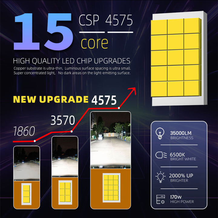 EXTREME BRIGHTNESS WITH 15-CORE CSP 4575 CHIPS: Engineered with the latest 15-core CSP 4575 LED bead technology, this headlight kit delivers a massive 35,000 Lumens and 170W of power per set. With a 6500K cool white color temperature, these bulbs are 2000% brighter than standard halogens, providing a wider and further lighting range to eliminate dark areas on the road.